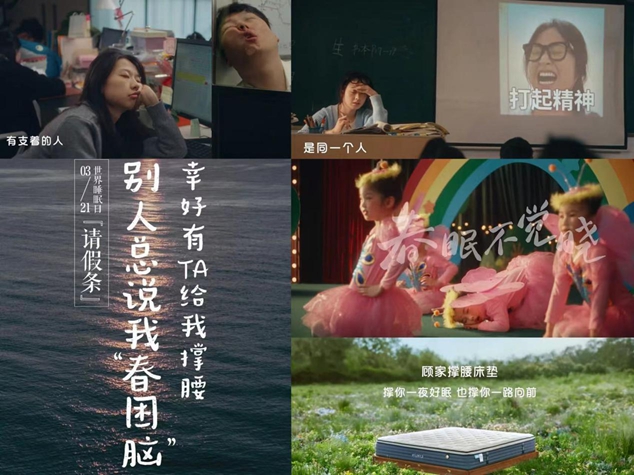 顾家家居:为迎接321世界睡眠日,顾家携手人民日报新媒体推出了一部主题视频《春眠不觉晓》,旨在探讨春季常见的春困现象。这部视频通过描绘不同职业人士在春日里不同的睡眠状态,如早起的上班族、穿着玩偶服卖气球的母子、在讲台上不慎入睡的老师以及卖花的奶奶,展现了春困对日常生活的影响。广告中传达了一种信息,即无论身处何种职业,人们都能在春天的温暖中找到前进的力量,即便偶尔在公共场合打盹也无损他们的工作热情。虽然顾家家展现了春困现象,并巧妙地结合了产品特点,但其营销策略可能过于依赖情感诉求而忽视了产品本身的具体优势和技术细节。