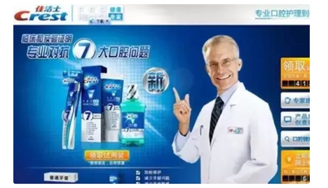 牙膏广告尤其是佳洁士牙膏的“专家”形象就是一个典型例子。其广告语中经常出现身穿白大褂的外国人,并附上文案“临床和实验证明,专业对抗7大口腔问题”,对于消费者来说,“专家”身份代表着权威,洋人更代表着科技和专业,也会直觉地认为,这款牙膏是由全球著名科学家研究开发的,因此是可靠的,值得信赖的。