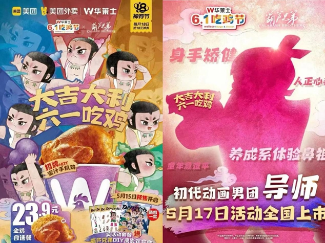 华莱士快餐与经典动画《葫芦兄弟》联名,推出了一场满载童年回忆的营销活动。购买特定活动套餐能获得一款葫芦兄弟DIY皮影戏盲盒。这次联名活动怀旧元素,以及在官方社交媒体上发布了“猜猜看”活动,鼓励粉丝在评论区分享猜测,增加了大朋友和小朋友的互动性。如果还是从辩证角度,葫芦娃这个IP是否依旧是大朋友的回忆杀仍然需要进一步认证,而且这种策略可能过于依赖消费者的怀旧情感,忽视了产品本身的创新和质量提升,可能导致消费者对品牌只有短暂的兴趣。
